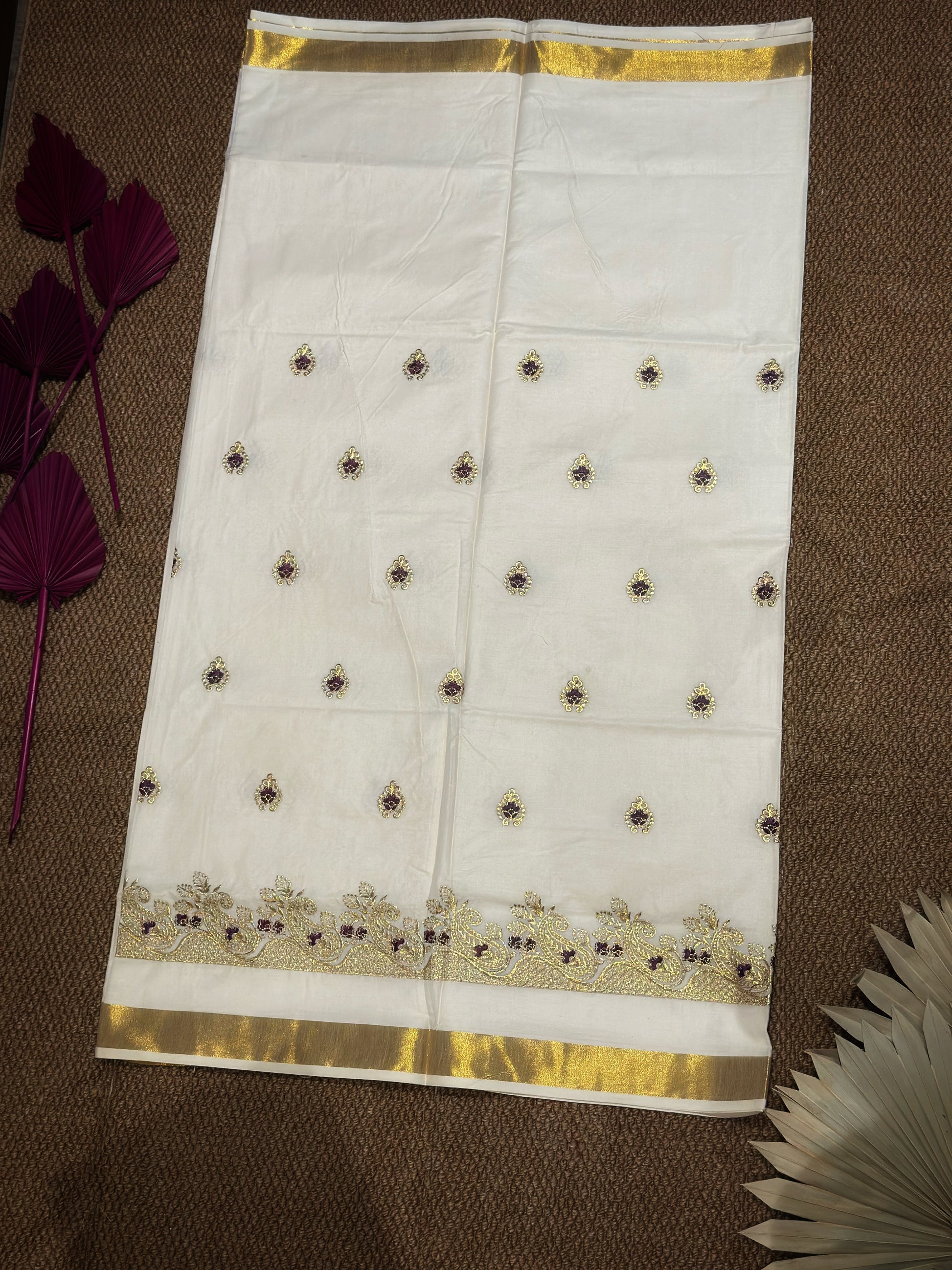 An ode to Kerala's serene spirit—this ivory Kasav saree is woven with symbolic lotus motifs and temple patterns in soothing olive green and gold zari.