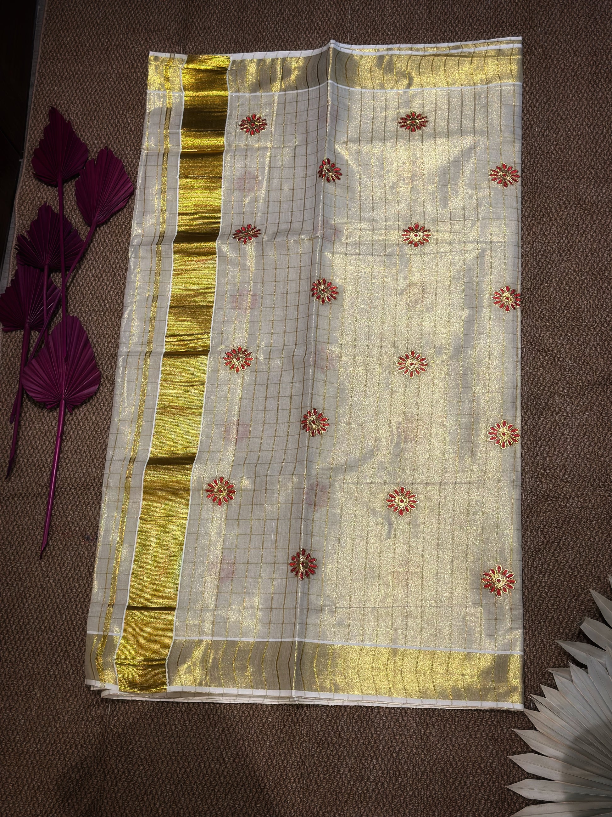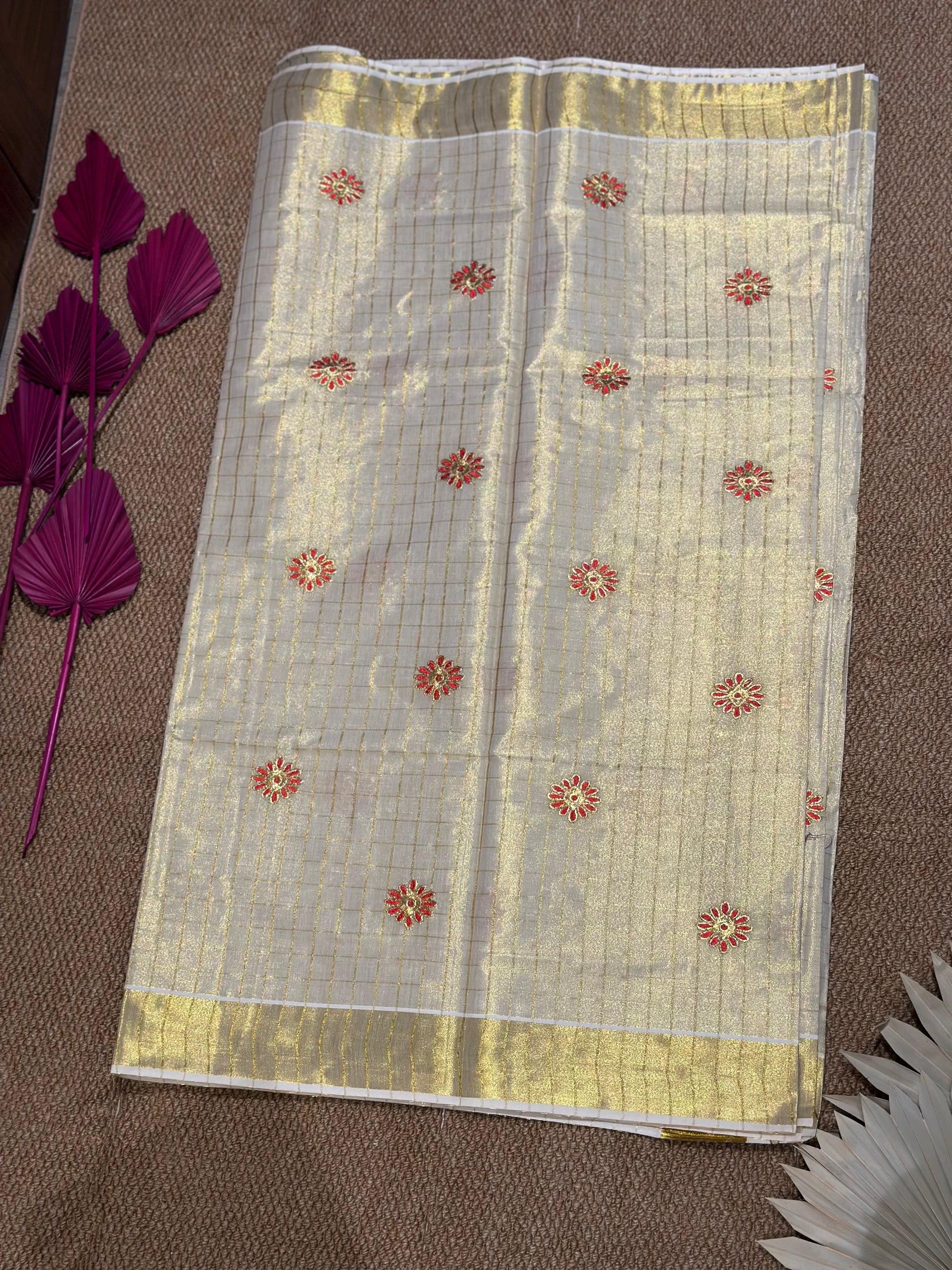 Ivory Kerala Kasav Saree with Red Floral Embroidery & Gold Checks