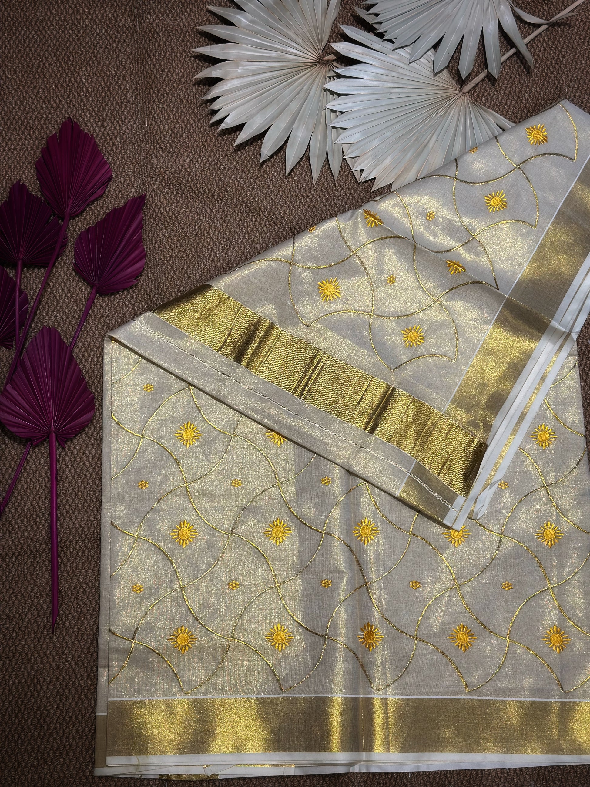 Bring sunshine into your celebrations with this exquisite ivory Kerala Kasav saree, adorned with delicate golden sunflower embroidery and shimmering kasavu zari work. The subtle wave pattern embroidered across the body adds graceful movement, while the floral accents bring a fresh, uplifting charm.