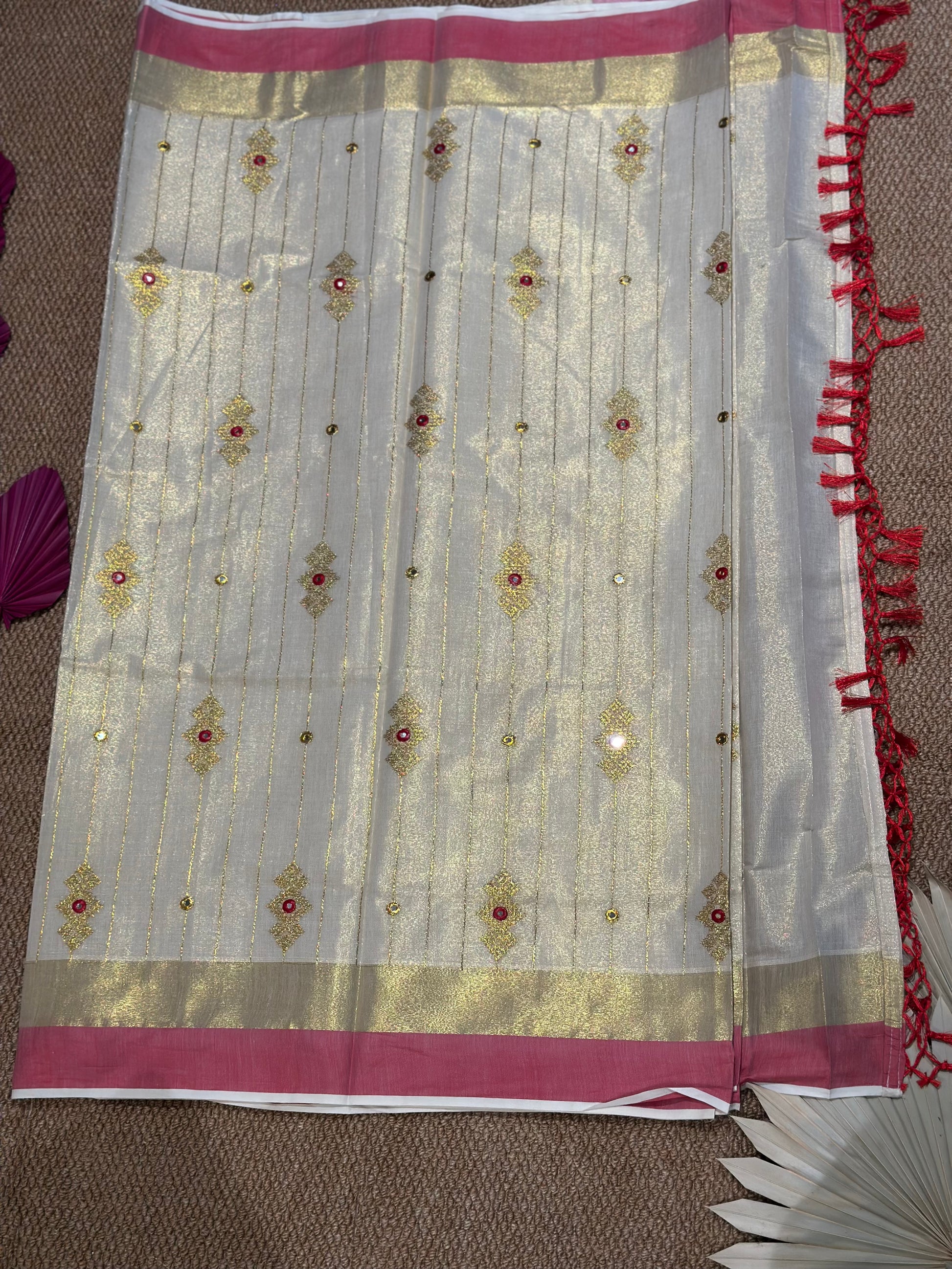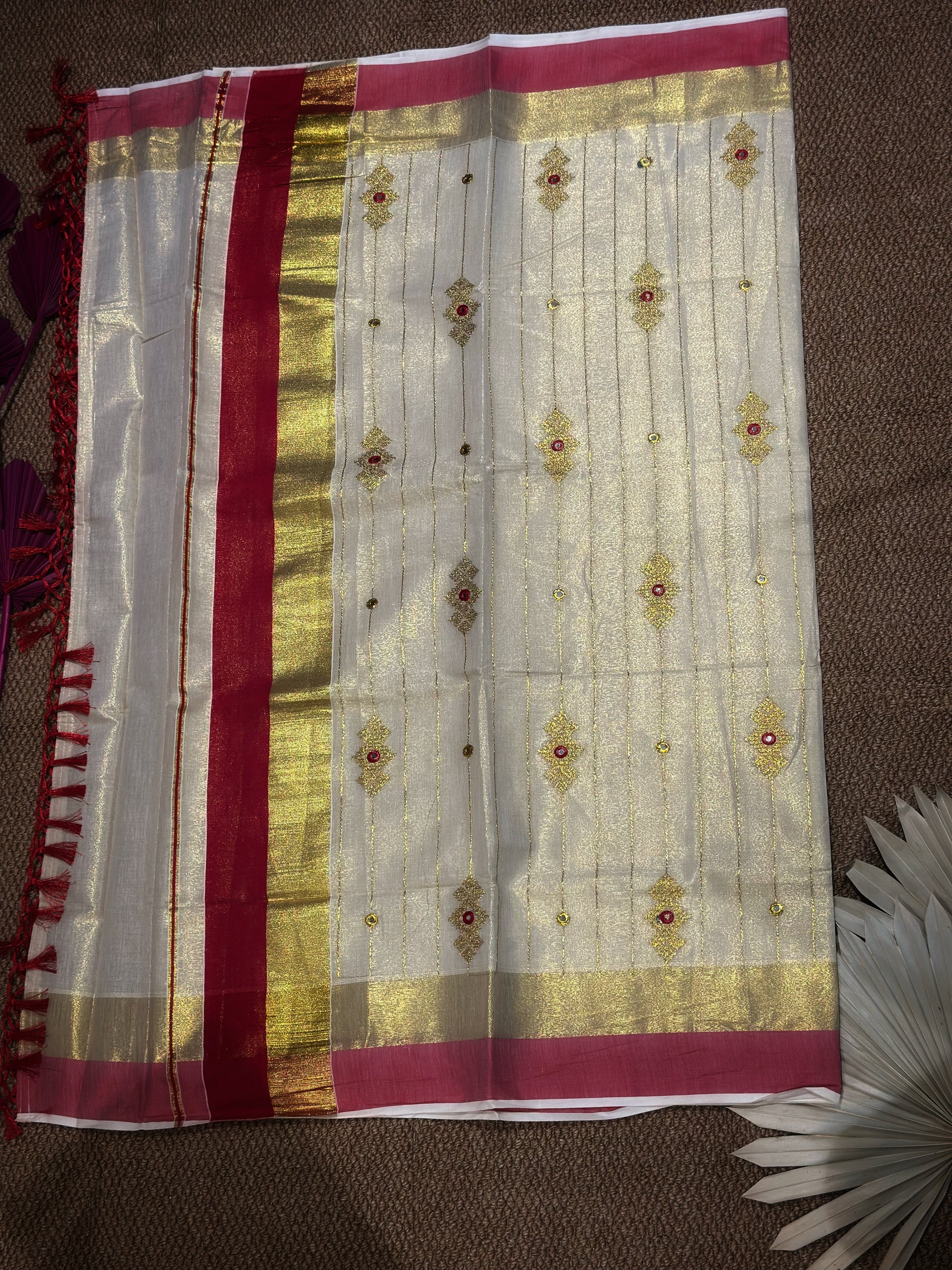 Ivory Kerala Kasav Saree with Red Border & Mirror Work