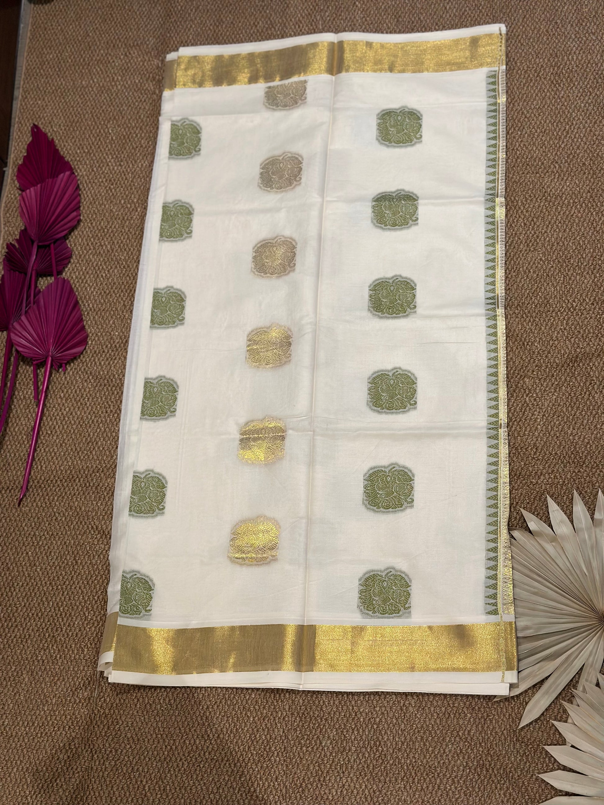 Delicate yet distinctive, the olive green medallion and triangle motifs give the drape a contemporary edge while staying rooted in heritage. Woven from breathable cotton with lustrous kasavu threads, this saree is both lightweight and luxurious, making it ideal for cultural festivities, temple visits, or elegant daytime gatherings.