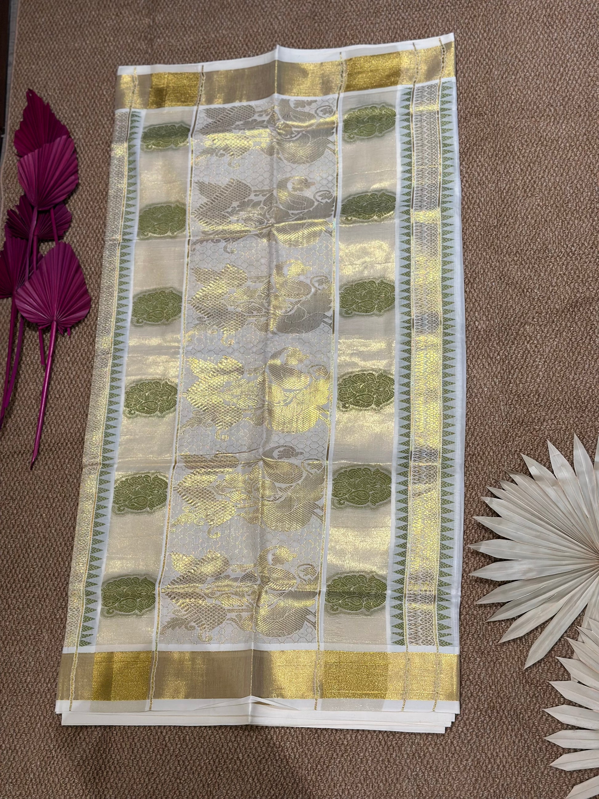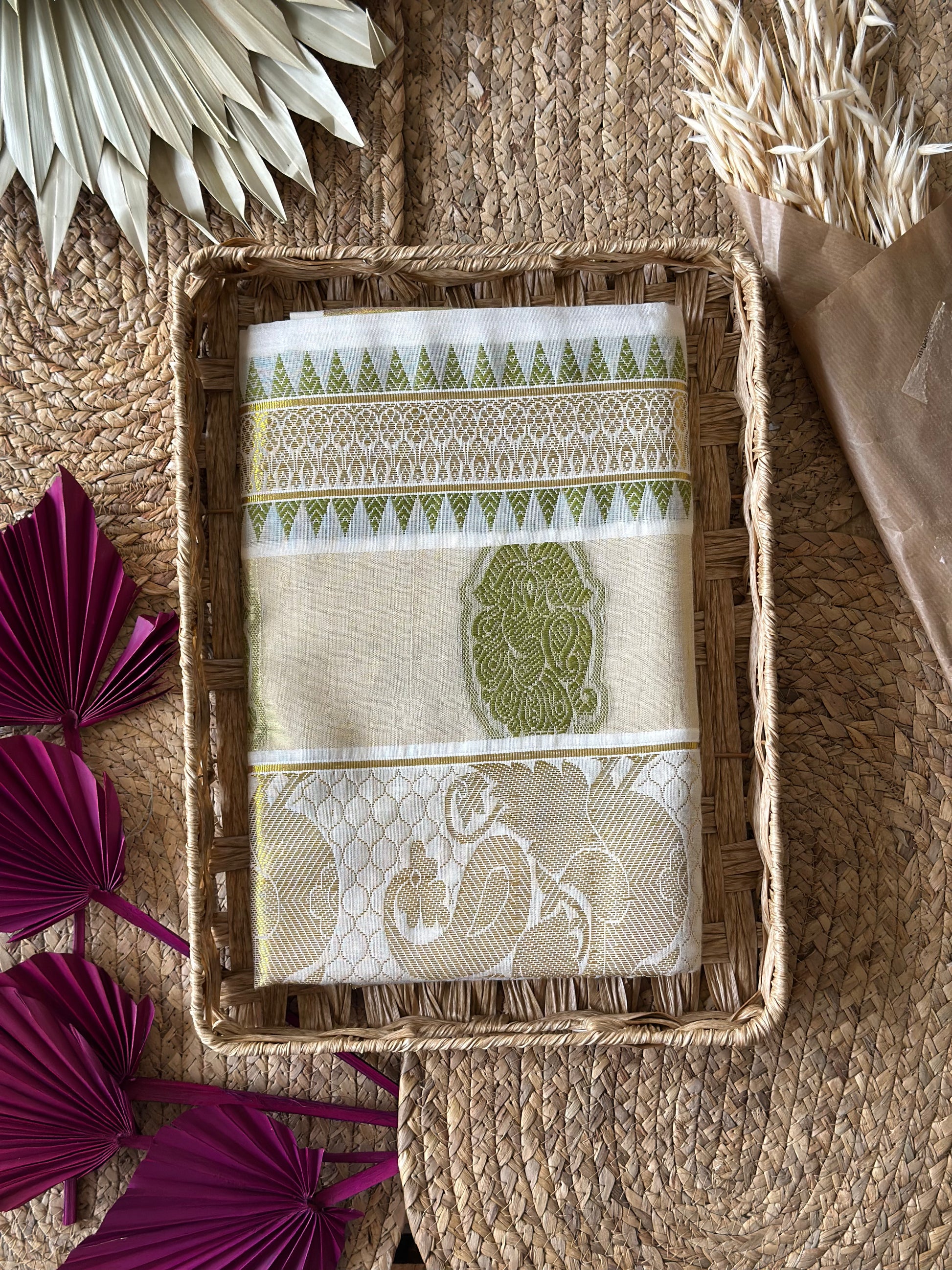 Olive Grace Kerala Kasav Set Saree with Elephant and Temple Motifs