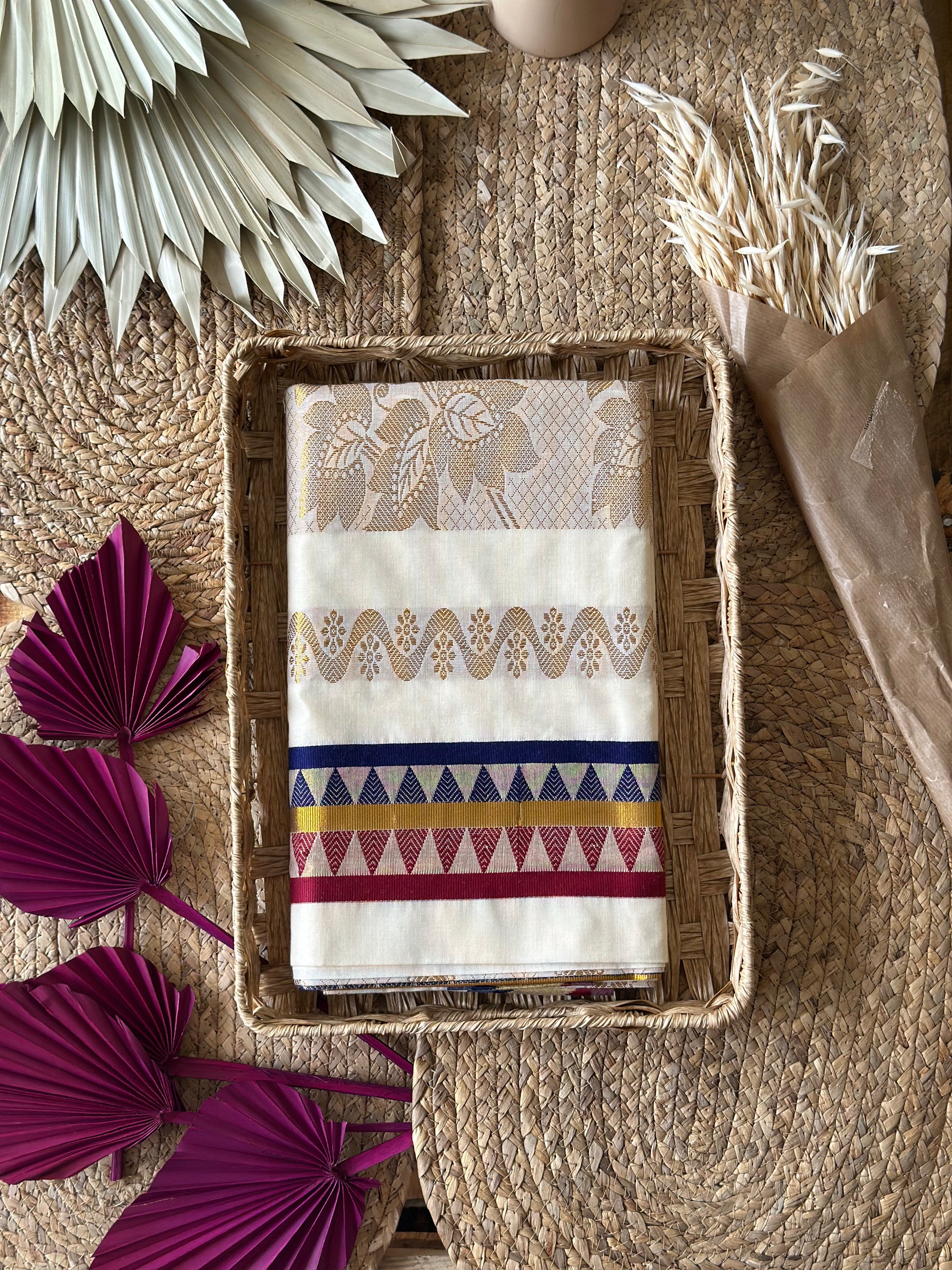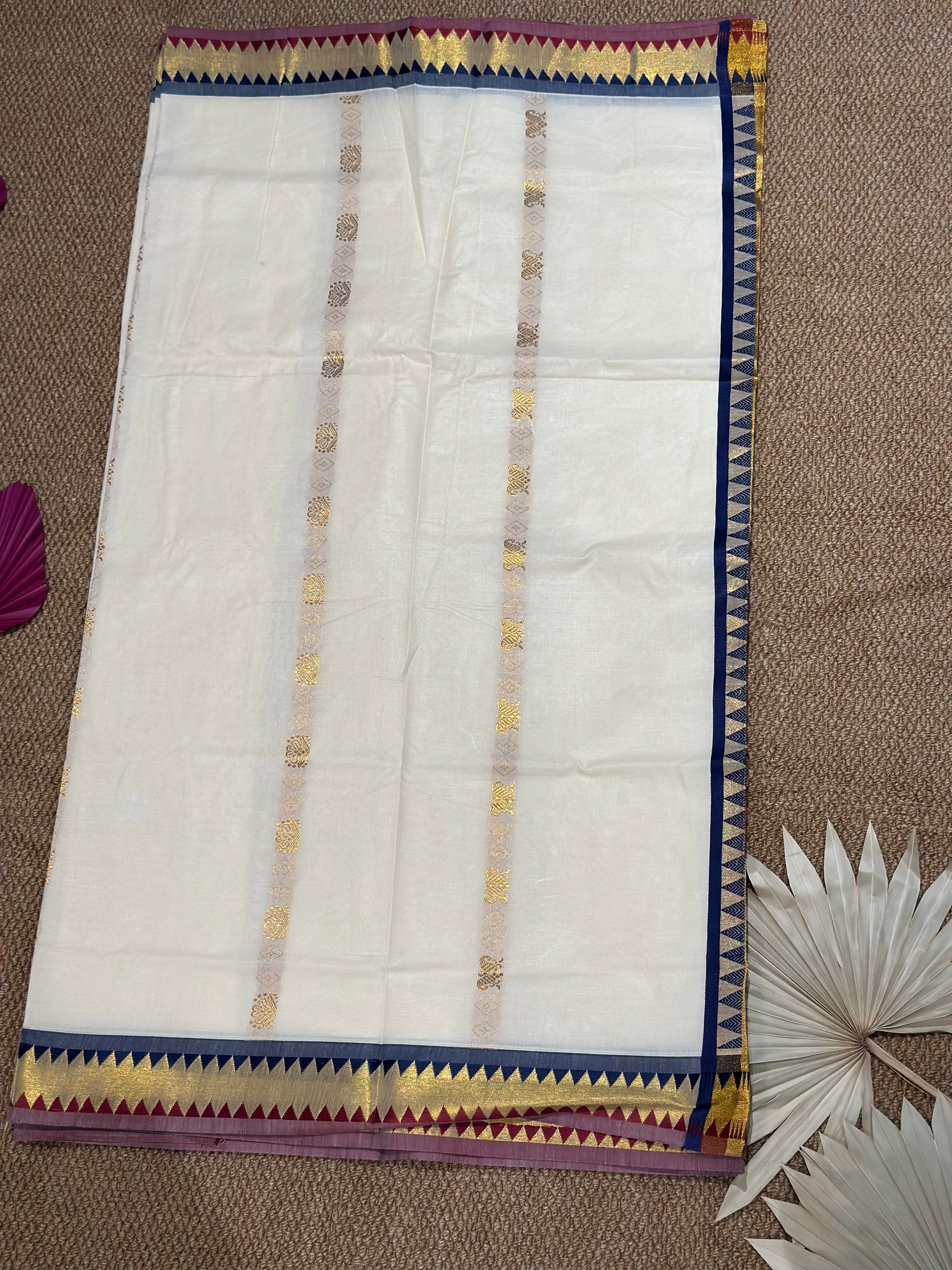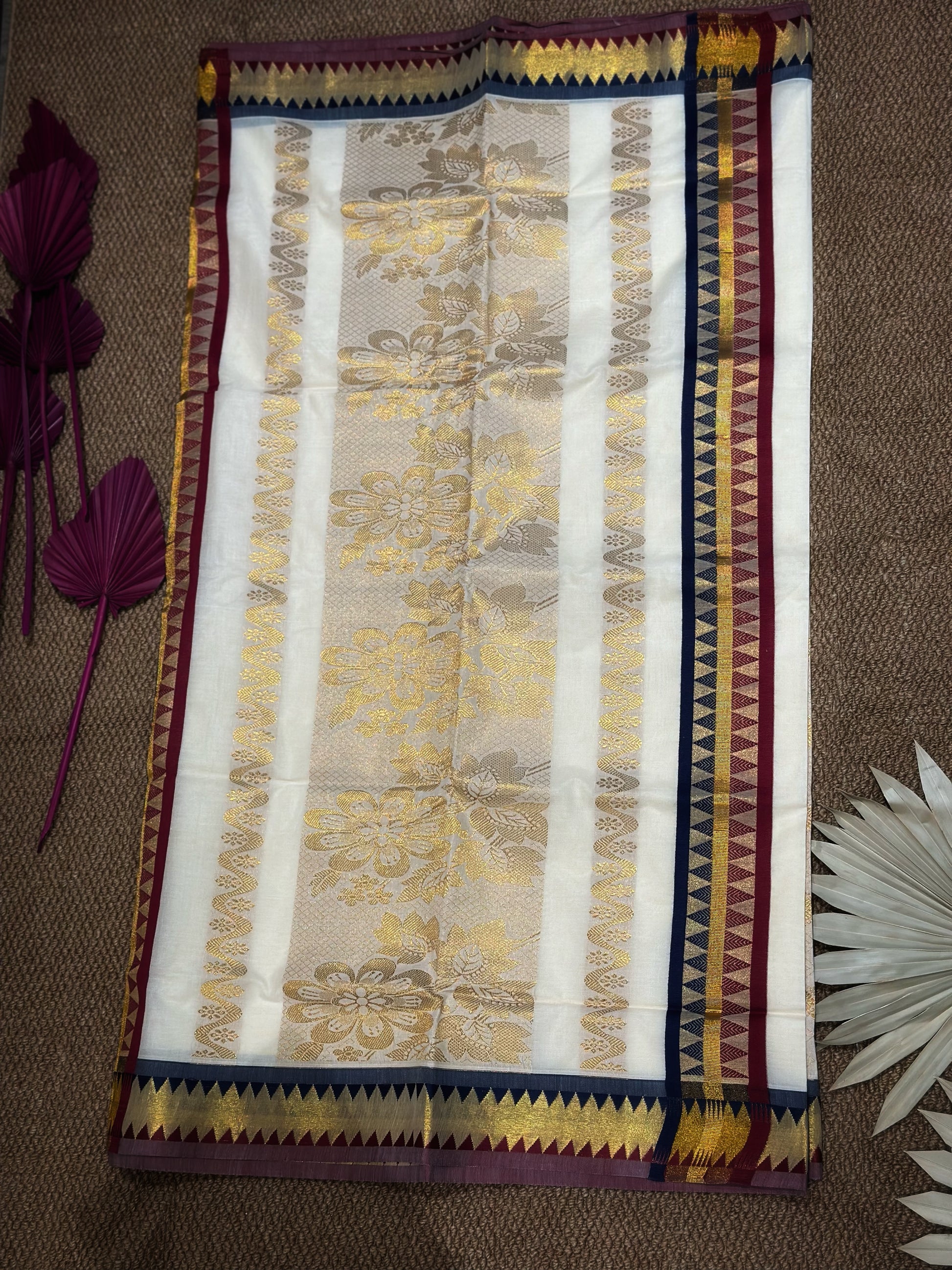 A unique Saree with Red and blue border made of soft cotton. the saree has a grand pallu with folwer based motifs weaved into the saree with gold and silver thread.